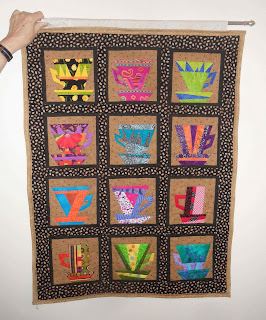 The CUPS wall hanging - just one thing left. I need to hand stitch the hanging sleeve you can see at the top so when I hang it on the wall, that will not show. Oh, and I need to figure out how to drill holes in the super hard plaster the walls are made of here in Ecuador. Of course, it is not perfect but I'm very happy with it and proud I learned a lot about paper piecing. I LOVE quilting!